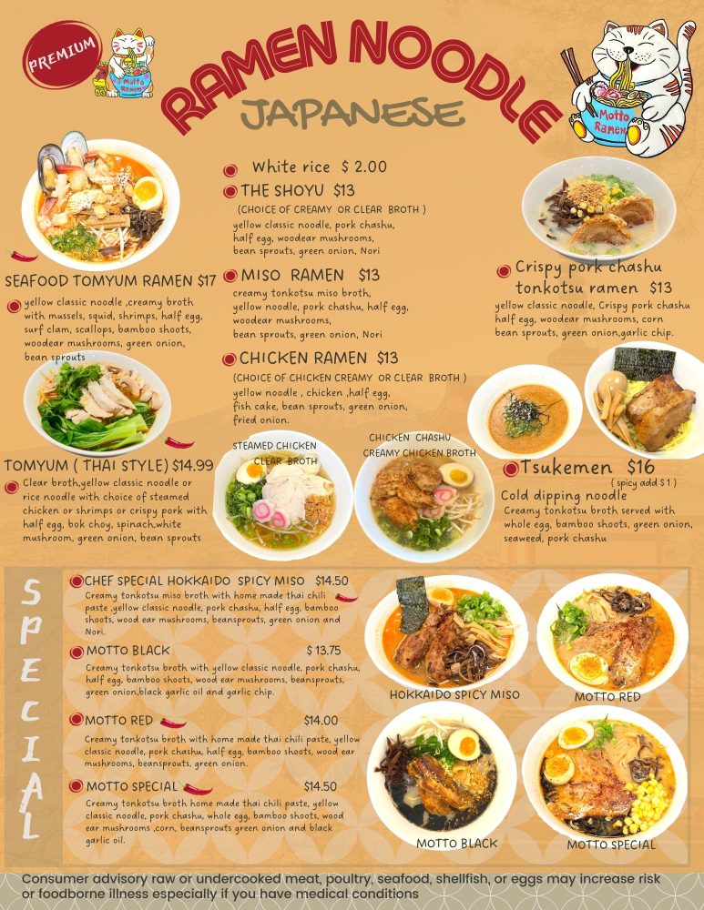 Introducing Motto Ramen, a trendy and casual Asian-owned restaurant in Westminster, CA. This gem offers a diverse menu with vegan and vegetarian options, customizable ramen bowls, and a variety of sushi dishes. Known for their rich and creamy tom kha soup, customers rave about the Motto Special Spicy Miso ramen and the Moto Black with its unique black garlic oil. The welcoming staff, fast service, and ample parking make dining here a breeze. With options for happy hour and private dining, Motto Ramen caters to all occasions. Don't miss out on the crispy pork buns or the Spicer ramen for a flavorful experience. Whether you're a ramen enthusiast or sushi lover, Motto Ramen is the perfect blend of traditional flavors and modern twists.